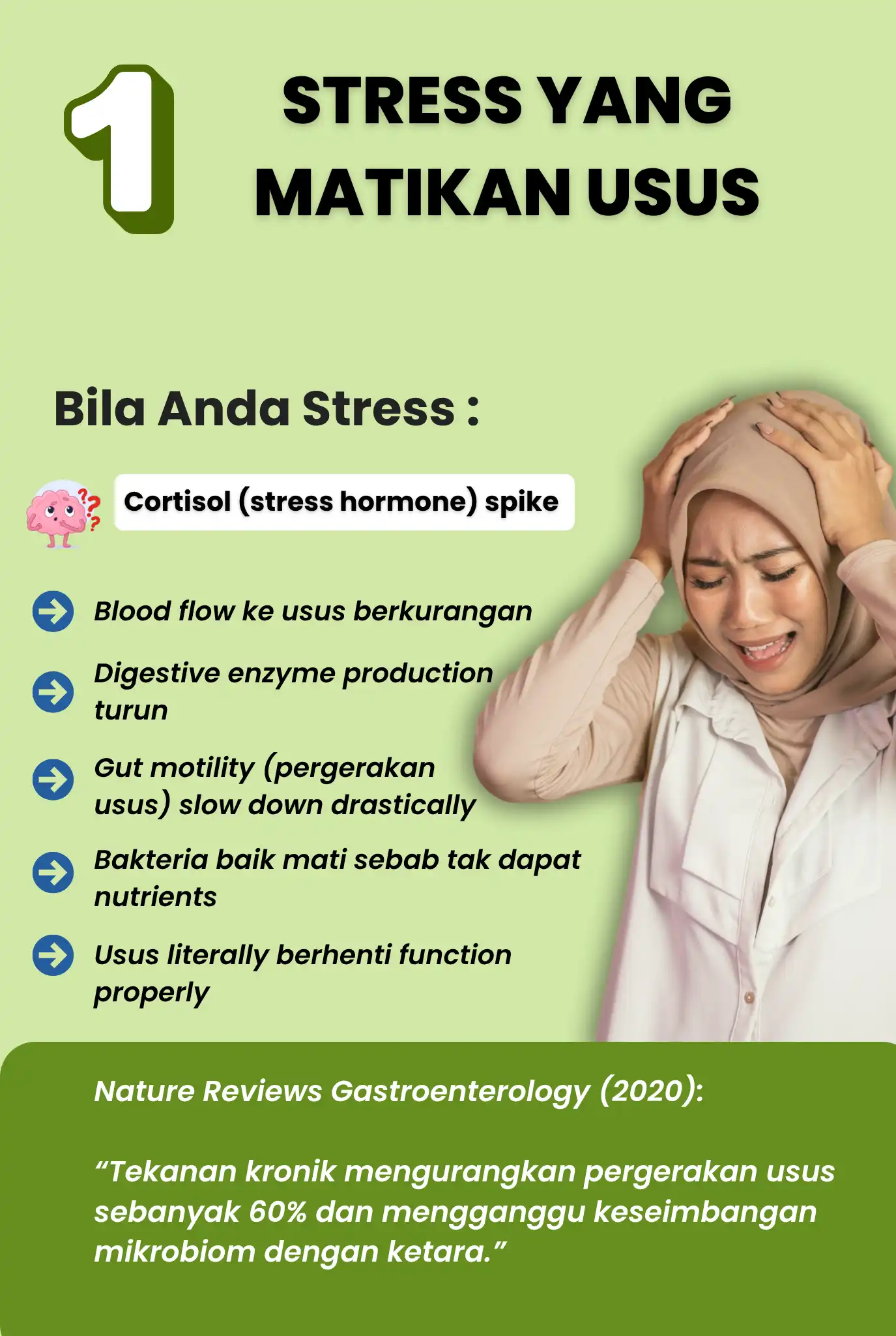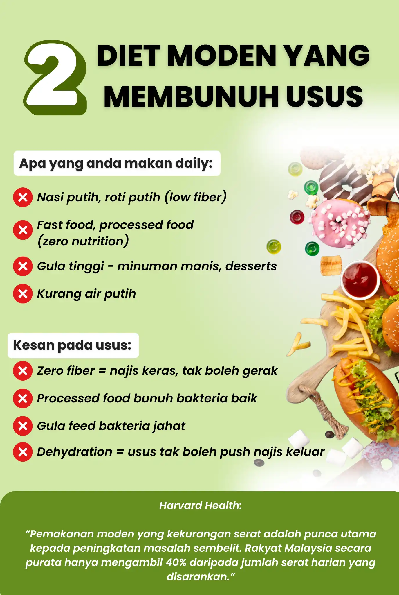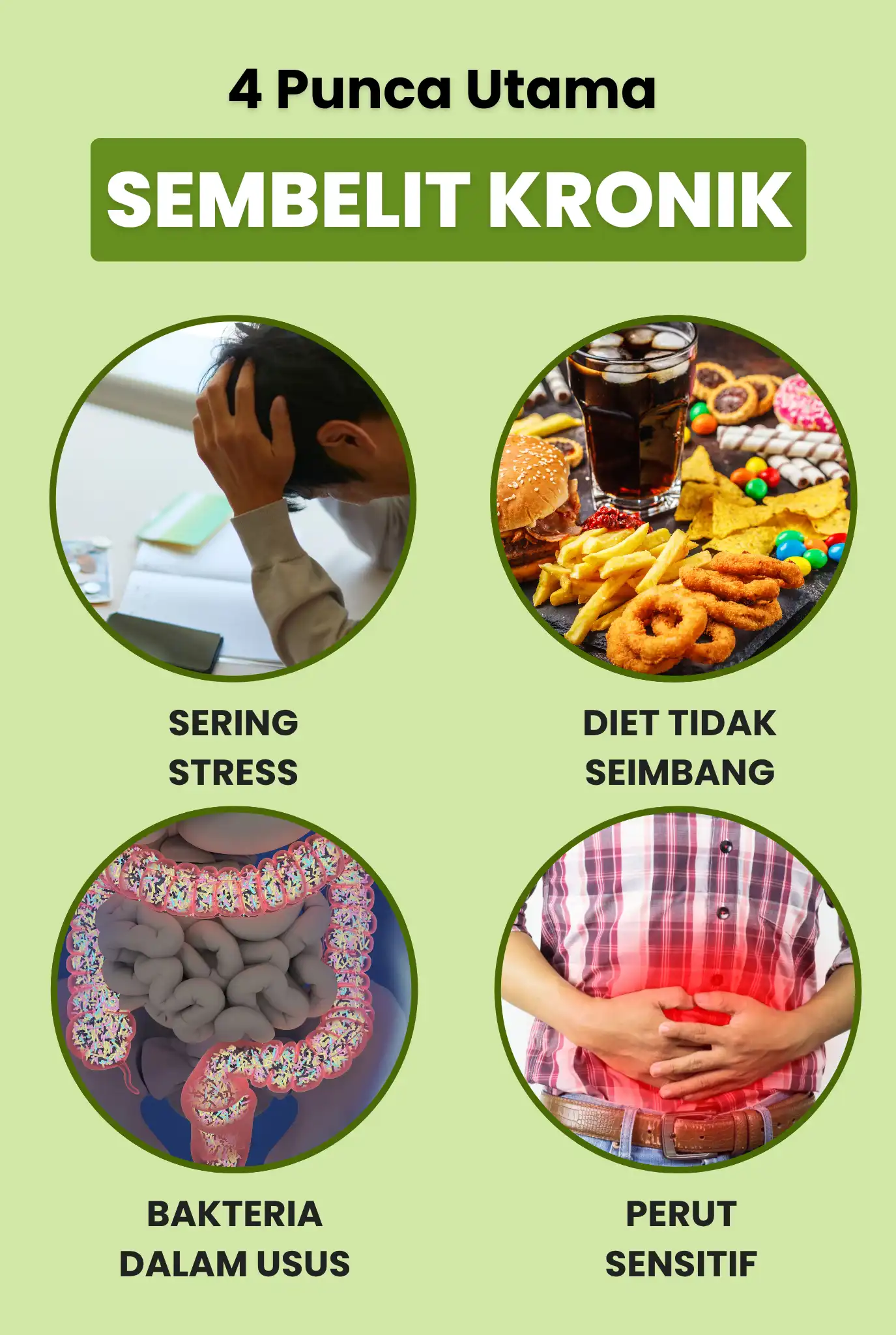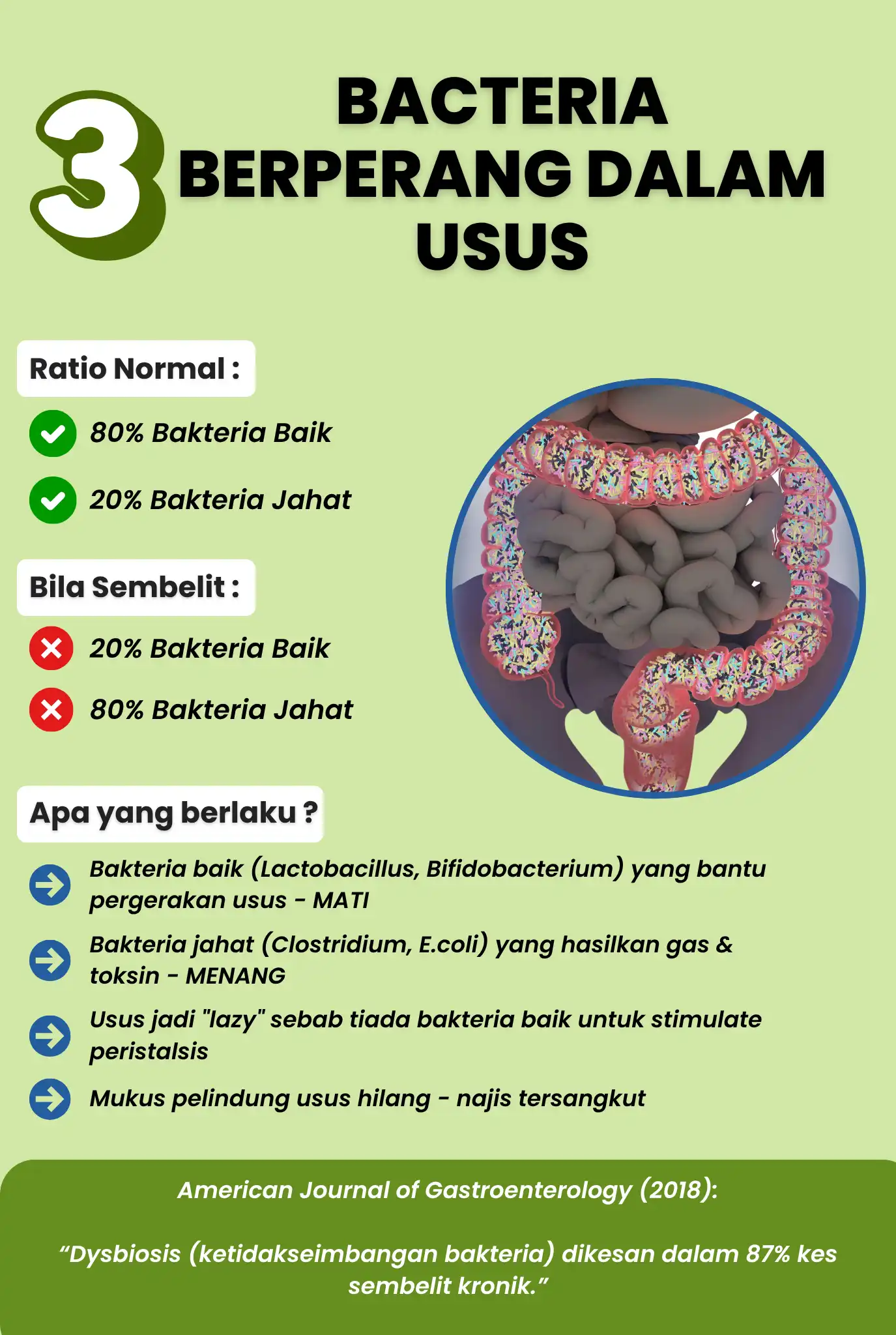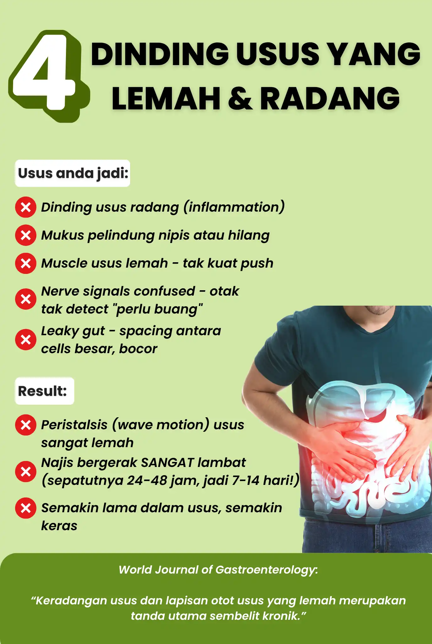 Root cause sembelit: BAKTERIA USUS ROSAK + DINDING USUS RADANG